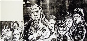 "Sotto le stelle", ein Holzschnitt der auf Baumwolle gedruckt wurde, beschreibt eine Flüchtlingsfamilie. Das Haustier - eine Katze - darf nicht fehlen. die Künstlerin ist auch eine engagierte Tierschützerin.