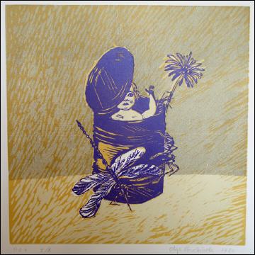 "Pandora", ein Holzschnitt in Mehrfarbendruck: Für jede Farbe wurde eine eigene Druckplatte angefertigt (in diesem Fall aus Pappelholz). Bei Olga Rusterholz ist Pandora keine verführerische femme fatale und keine zerstörerische Elementargewalt, sondern eine Puppe - unschuldig am Dilemma ihres Tuns.