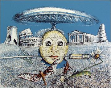 Durch Kriege und dem Zahn der Zeit zerstörte Bauwerke, ein Atompilz, Verfremdung der Natur durch Chemie und ein Eierkopf als Symbol des Menschen in der Mitte der Grafik zeigen in vielfacher Weise die Verfehlungen der Menschheit.