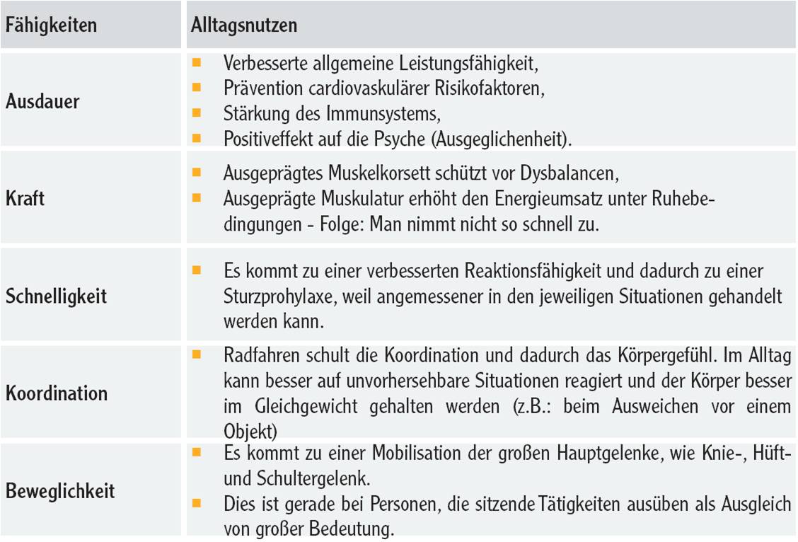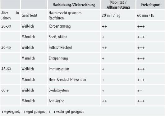 Radfahren hat für die Menschen eine Vielzahl an positiven gesundheitlichen Effekten (siehe Kap. 1). Jedoch unterscheiden sich die Zielsetzungen auf Grund bestimmter Faktoren, wie Alter und Geschlecht. In verschiedenen Altersstufen treten jeweils bestimmte gesundheitlichen Ziele, Beschwerden oder Erkrankungen besonders stark in den Fokus, so dass in der folgenden Tabelle jeweils der Hauptaspekt jeder Zielgruppe beschrieben ist. Diese Tabelle ist jedoch nur eine Orientierung, so dass im Einzelfall die genannten Vorzüge auch in anderer Form bewertet werden können. Generell bietet ein regelmässiges Radfahren im Alltag die Möglichkeit, für die meisten gesundheitlichen Themen eine Verbesserung herbeizuführen. In der Regel ist dieses jedoch durch gezieltes Training weitaus effektiver zu erreichen, weshalb am besten Beides miteinander verbunden werden sollte.