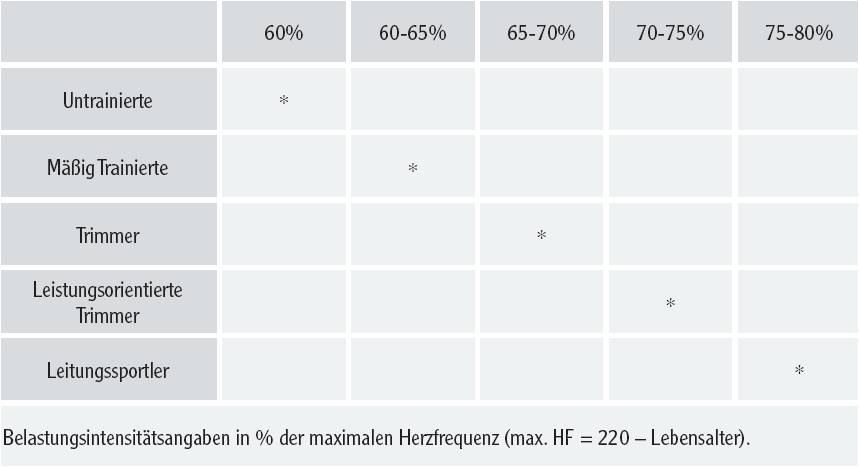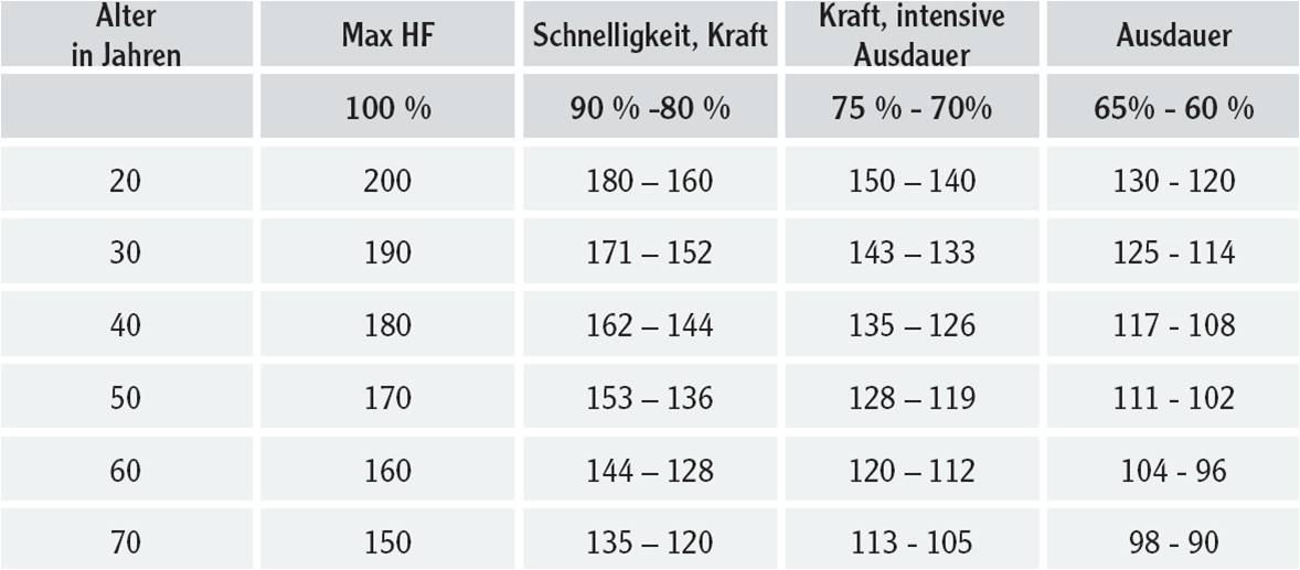 Die maximale Herzfrequenz (HF) beträgt bei einem 20 Jährigen im Normalfall damit 200 Schläge pro Minute. Bei einem 70 Jährigen 150 Schläge pro Minute. Daraus folgt, dass eine relative Trainingsherzfrequenz befolgt werden sollte. Diese kann einfach über eine prozentuale Orientierung erfolgen, indem der Prozentwert der maximalen Herzfrequenz angegeben wird. Bei einer Intensität von 70 % beträgt damit die Herzfrequenz 140 Schläge pro Minute bei einem 20 jährigen und 105 Schläge bei dem 70 jährigen.