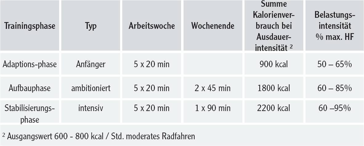 Um den Trainingseffekt durch das Radfahren für die Gesundheit und das Wohlbefinden optimal ausschöpfen zu können, sind eine Berücksichtigung der individuellen Voraussetzungen und die Trainingsfortschritte aller körperlichen Systeme notwendig. Ein Training von Anfängern besitzt damit einen anderen Charakter als das Training von Fortgeschrittenen. Wir empfehlen daher einen Aufbau in drei Belastungsstufen, die von Anfängern alle durchlaufen werden müssen, während Fortgeschrittene entsprechend ihres Leistungsvermögens erst auf einer höheren Stufe einsteigen.