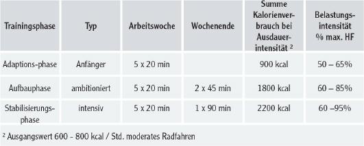 Anfänger und schlecht ausdauertrainierte Personen beginnen am Besten zunächst mit leichtem Radeln und gewöhnen sich damit an die Belastung. Diese Adaptationsphase, die in der Regel vier bis sechs Wochen dauern sollte, bietet die beste Prophylaxe vor den häufig am Anfang des Trainings stehenden Muskel und Gelenkschmerzen. Erst wenn der Körper sich an die ungewohnte Belastung adaptiert hat, kann mit dem eigentlichen Training begonnen werden.