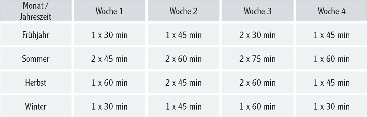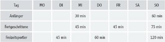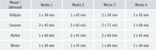 Für das so wichtige allgemeine Grundlagentraining sollten relativ Untrainierte und Anfänger sich an folgender Tabelle orientieren: