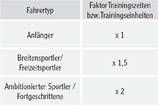 Diese Angaben bieten eine Orientierung für den freizeit- und gesundheitsorientierten Fahrer. Ambitioniertere Fahrer können die Trainingszeiten erhöhen und zusätzliche Trainingseinheiten durchführen. Folgender Anhaltspunkt kann dafür gegeben werden: