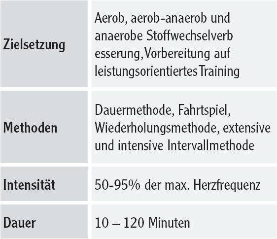 Allen Zielen jedoch ist gemeinsam, dass immer die allgemeine Grundlagenausdauer die Basis für alle gesundheitlichen Ziele darstellt und somit immer den Hauptbestandteil der Belastung darstellt.