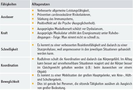 Ein sportliches Training mit dem Fahrrad ist im Gegensatz zu vielen anderen Sportarten nicht nur in jedem Alter durchzuführen, sondern auch bei geringer Leistungsfähigkeit oder Handicaps. Die Vorteile liegen insbesondere in der Möglichkeit, auch mit geringer Leistungsfähigkeit die Belastung richtig dosieren zu können. Zudem werden Gelenke und Muskeln nicht in überhöhtem Masse strapaziert, so dass es im Vergleich zu anderen Aktivitäten zu weniger Beschwerden kommt (z.B. Spielsportarten). Zudem kann mit dem Einsatz des Fahrrades im Alltag ein Teil an fehlender Bewegung ausgeglichen werden. Allerdings sollte und kann es kein Ziel sein, den Sport oder bestimmte Sportarten zu substituieren, da wie oben gezeigt die Effektivität im Sport oft wesentlich höher ist.