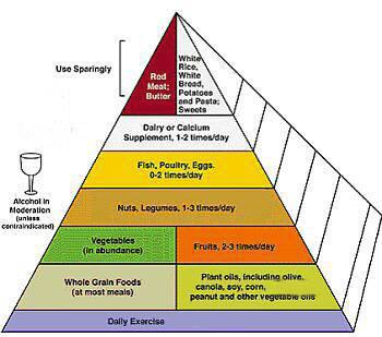 Brauchbar ist auch eine neue Nahrungsmittelpyramide von Prof. Walter C.Willett von der Harvard-Universität. Er setzt darin rigoros die wissenschaftliche Evidenz um, nach der weder Fette noch Kohlenhydrate pauschal als gut oder schlecht einzustufen sind. In der breiten Basis finden sich ungesättigte Fettsäuren und KH mit einem niedrigen glykämischen Index (GI), also v.a. Vollkornprodukte. Zuoberst stehen KH mit einem hohen GI sowie Nahrungsmittel, die wie Butter v.a. gesättigte Fettsäuren enthalten. Zusätzlich steht prominent im Sockel der Willett-Pyramide, was auch bei mir zentral erwähnt ist: die Aufforderung zu vermehrter körperlicher Aktivität!