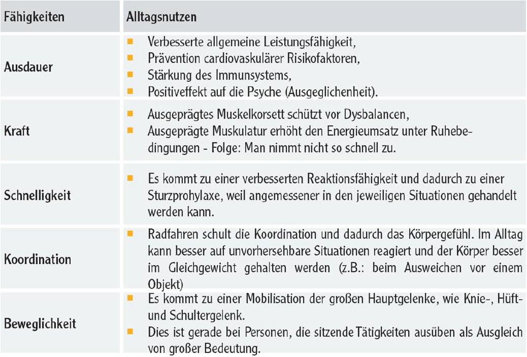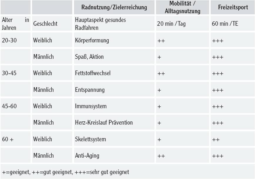 Radfahren hat für die Menschen eine Vielzahl an positiven gesundheitlichen Effekten (siehe Kap. 1). Jedoch unterscheiden sich die Zielsetzungen auf Grund bestimmter Faktoren, wie Alter und Geschlecht. In verschiedenen Altersstufen treten jeweils bestimmte gesundheitlichen Ziele, Beschwerden oder Erkrankungen besonders stark in den Fokus, so dass in der folgenden Tabelle jeweils der Hauptaspekt jeder Zielgruppe beschrieben ist. Diese Tabelle ist jedoch nur eine Orientierung, so dass im Einzelfall die genannten Vorzüge auch in anderer Form bewertet werden können. Generell bietet ein regelmässiges Radfahren im Alltag die Möglichkeit, für die meisten gesundheitlichen Themen eine Verbesserung herbeizuführen. In der Regel ist dieses jedoch durch gezieltes Training weitaus effektiver zu erreichen, weshalb am besten Beides miteinander verbunden werden sollte.