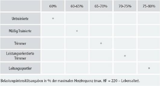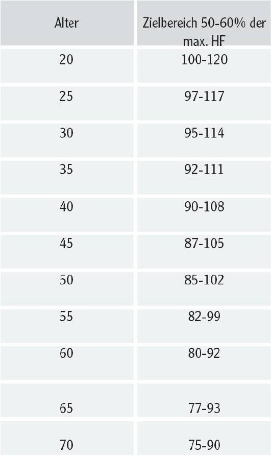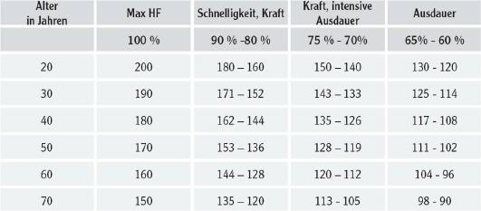 Die maximale Herzfrequenz (HF) beträgt bei einem 20 Jährigen im Normalfall damit 200 Schläge pro Minute. Bei einem 70 Jährigen 150 Schläge pro Minute. Daraus folgt, dass eine relative Trainingsherzfrequenz befolgt werden sollte. Diese kann einfach über eine prozentuale Orientierung erfolgen, indem der Prozentwert der maximalen Herzfrequenz angegeben wird. Bei einer Intensität von 70 % beträgt damit die Herzfrequenz 140 Schläge pro Minute bei einem 20 jährigen und 105 Schläge bei dem 70 jährigen.