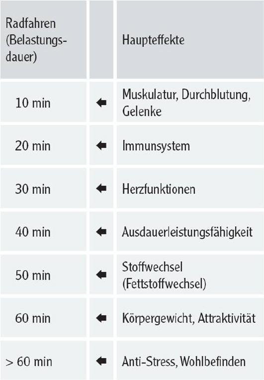 Die Effekte des Radfahrens auf die Gesundheit und speziell die psycho-physischen Funktionen und Fähigkeiten sind primär von der Einwirkungszeit (= Belastungsdauer) und von der Höhe der Belastung pro Zeiteinheit (= Belastungsintensität) abhängig. Bei den meisten Parametern repräsentiert die Belastungsdauer die entscheidende Grösse, so dass wir zusammenfassend eine Zusammenstellung der Wirkmechanismen in Abhängigkeit von der Trainingszeit vornehmen. Dabei sind nur die Haupteffekte für die Gesundheit und das Wohlbefinden angeführt, wenngleich sich auch immer Paralleleffekte der Aktivität ergeben und sich auch gegenseitige Einflüsse der Veränderungen feststellen lassen.