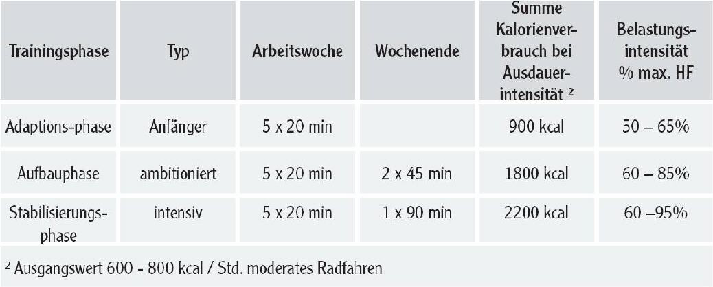 Eine Kategorisierung der Radfahrer erlaubt eine Individualisierung und gleichzeitig eine allgemeine Trainingsempfehlung. Das erste Ziel von einem gesundheitsorientierten Radfahren sollte sein, regelmässig Rad zu fahren. Nur mit einer regelmässigen Betätigung können die meisten der in Kapitel 1 genannten psycho-physischen Veränderungen erreicht werden. Als Beispiel kann die Veränderung von Muskulatur oder eine Gewichtsabnahme angebracht werden. Dieses gilt nicht so stark für die psychischen Auswirkungen. Hier sind oft schon sehr kurzfristige Auswirkungen zu spüren. Beispielsweise tritt oft schon eine Ablenkung vom Alltag oder ein positives Körpergefühl innerhalb einer Fahrt ein.