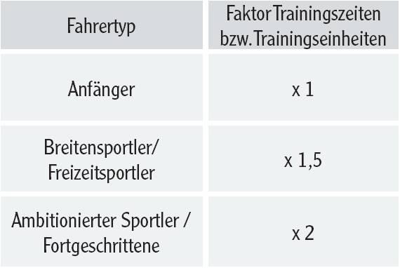 Diese Angaben bieten eine Orientierung für den freizeit- und gesundheitsorientierten Fahrer. Ambitioniertere Fahrer können die Trainingszeiten erhöhen und zusätzliche Trainingseinheiten durchführen. Folgender Anhaltspunkt kann dafür gegeben werden:
