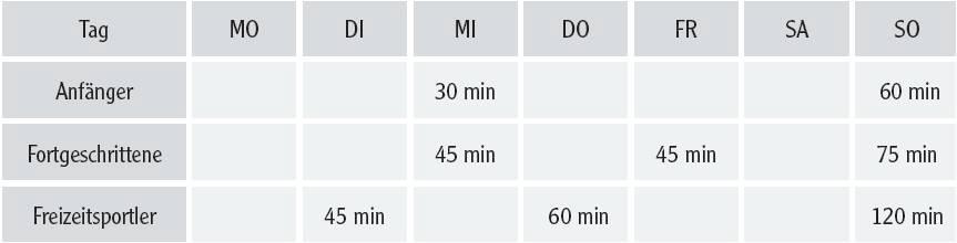 Für das so wichtige allgemeine Grundlagentraining sollten relativ Untrainierte und Anfänger sich an folgender Tabelle orientieren: